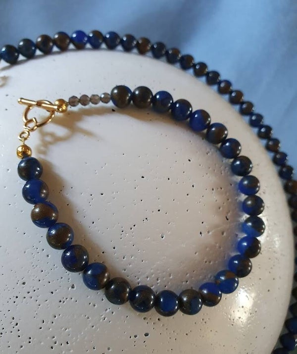 Let halskæde i 6mm Kalcedon og tilhørende armbånd med forgyldt bomlås og små 4 mm røgkvarts sten . Blå kalcedon har en lysende kraftig blå farve kombineret med en smuk varm brun tone. Halskæden måler 45 cm og armbåndet er str. M/L