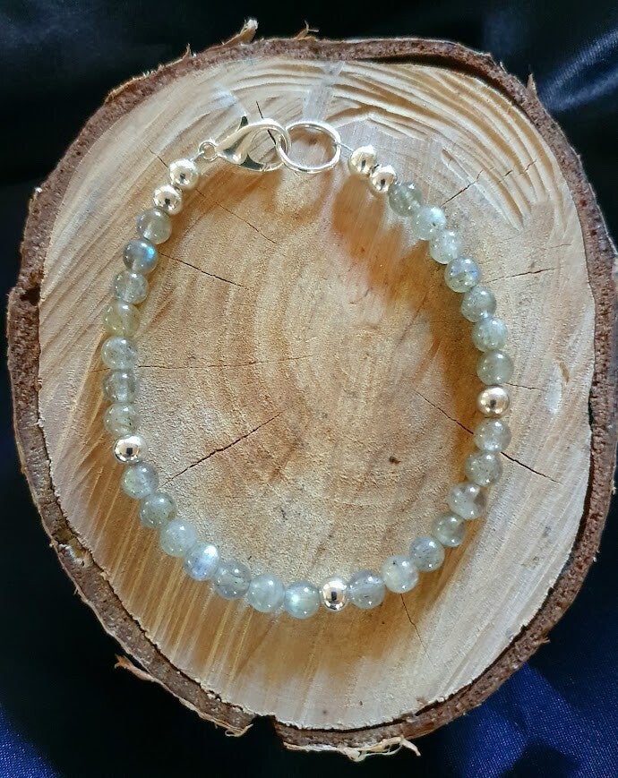 4 mm Labradorit, den lille uanselige grå sten som pludselig overrasker med sine blå glimt. Her sammen med sterlingsølv perler og karabinlås. Fåes i alle str.