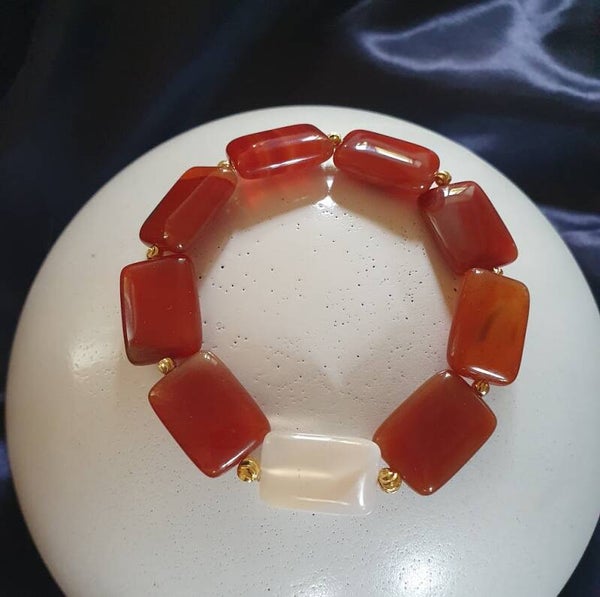Et klassisk stilrent armbånd af farvet båndAgat og fine forgyldte rillede perler. Nem karabinlås. Str. M